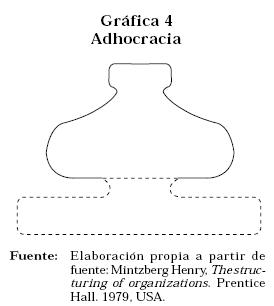la adhocracia es una organización joven y de jóvenes, con sofisticados sistemas técnicos en la parte administrativa. Es altamente popular, aunque no siempre la mejor elección. La especialización de los puestos está basada en un gran entrenamiento. Sus formas de innovación hacen inútil cualquier modelo que pretenda estandarizarla. Un ejemplo de este tipo de organizaciones lo constituye la agencia espacial norteamericana