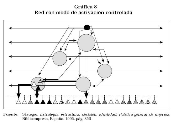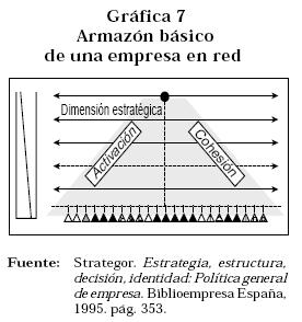 Es en este marco donde aparece la organización en red. Este nuevo modelo favorece la reducción del tamaño y la orientación hacia el negocio central basado en las competencias centrales que demanda el sector industrial. Las redes de firmas proliferan a lo largo de la cadena del valor que de pronto se vuelve virtual en un continuo que rebasa los conceptos tradicionales de espacio y tiempo. La complejidad de los mercados y la sofisticación tecnológica obligan al desarrollo de nuevas formas organizacionales, con la consigna básica de añadir valor y flexibilidad. Surge una interdependencia de empresas y la toma de decisión de equipos, tanto al interior como al exterior de dichas organizaciones, es un requisito de operación fundamental.