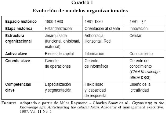 organización celular, de la que me ocuparé más adelante. La evolución de las formas organizacionales en el último siglo puede ser resumida en el